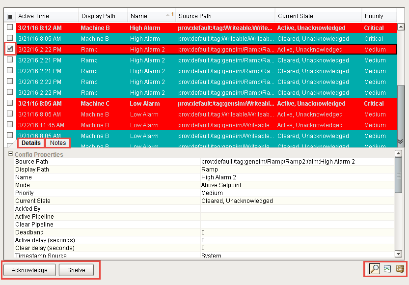 You can click on a individual alarm and use the buttons at the bottom of the table to Acknowledge or Shelve the selected alarm. You can also use the icons to view the alarm Details, Notes, and History.